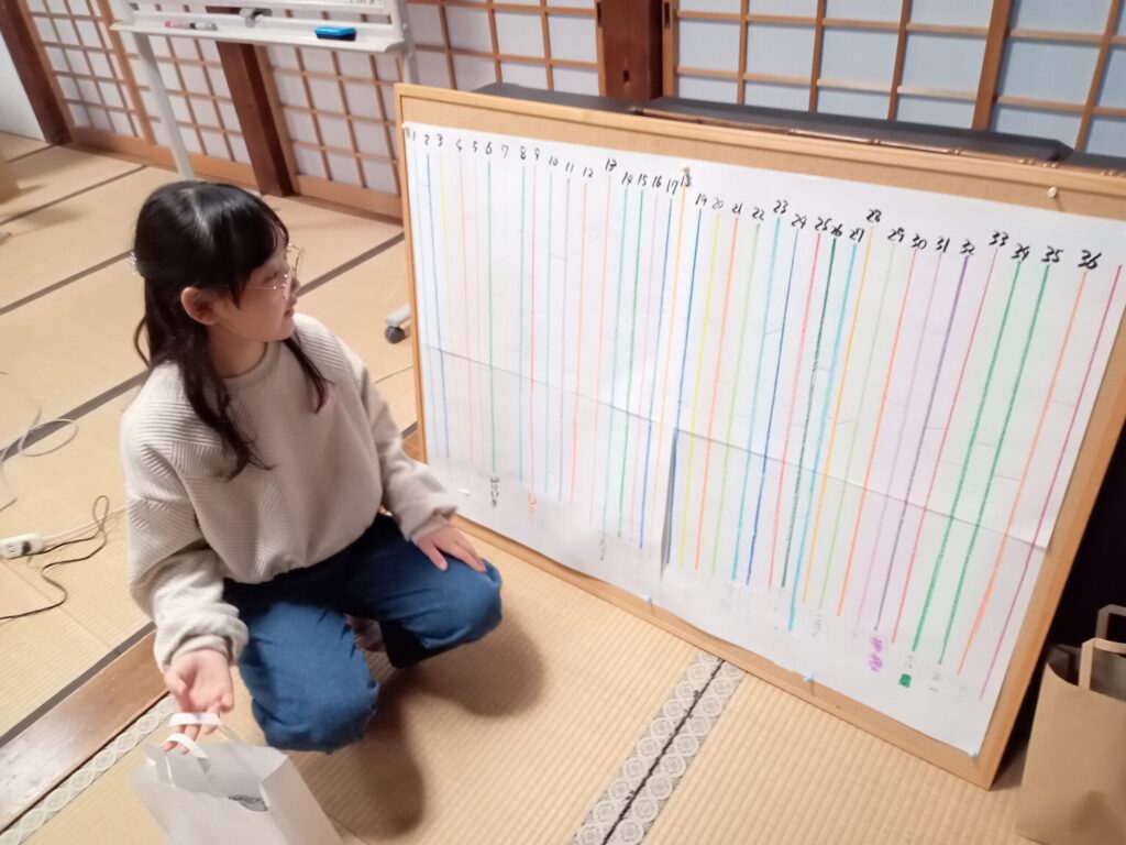 報恩講あみだくじに名札をはります。