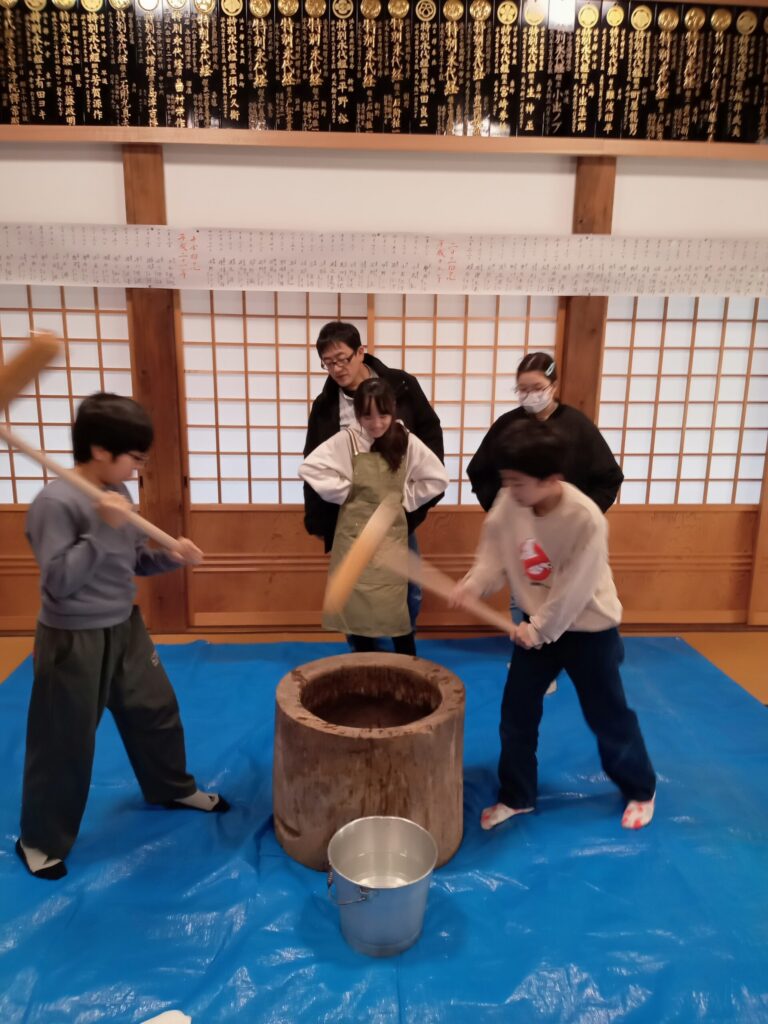 餅つきしました。 2025.12.31 日常 12月28日(日)14時~ 昨年に続いて、餅つきをしました。 最初に、鐘つきをして、正信偈のお勤めをしました。 ぺったんとリズムを合わせて 鏡もちをつくります。 きなこ&あんこをかけて、いただきます。 また来年もつきましょう!!